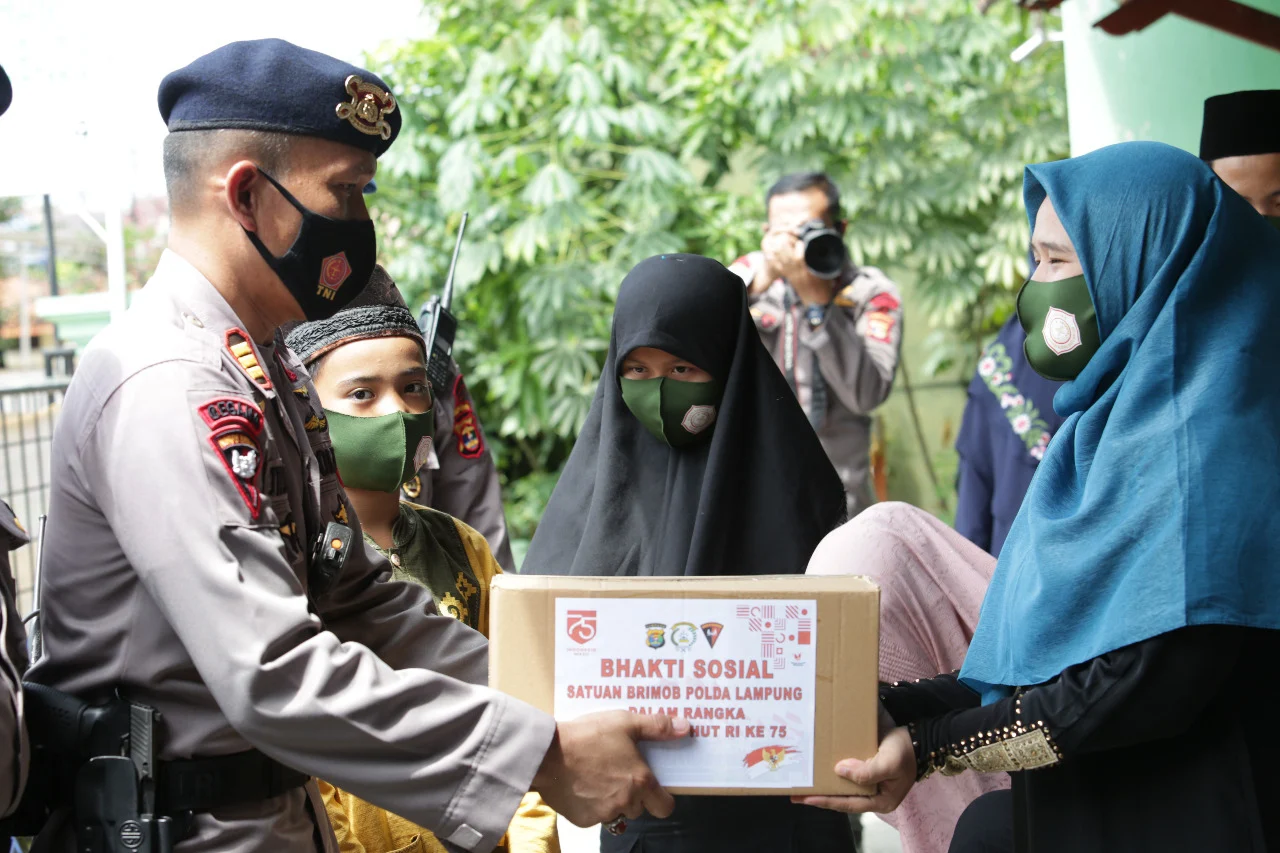 JS, BANDAR LAMPUNG - Satuan Brimob Lampung menggelar baksos berupa pembagian sembako Ke Panti asuhan Khoirul Amanah yang beralamat Jalan Pangeran Antasari dan Panti asuhan Raden Ajeng Ratu Balqis yang beralamat Jl. H. Said Bandar Lampung, dalam rangka memperingati HUT Kemerdekaan RI Ke 75, Rabu (19/08/2020).